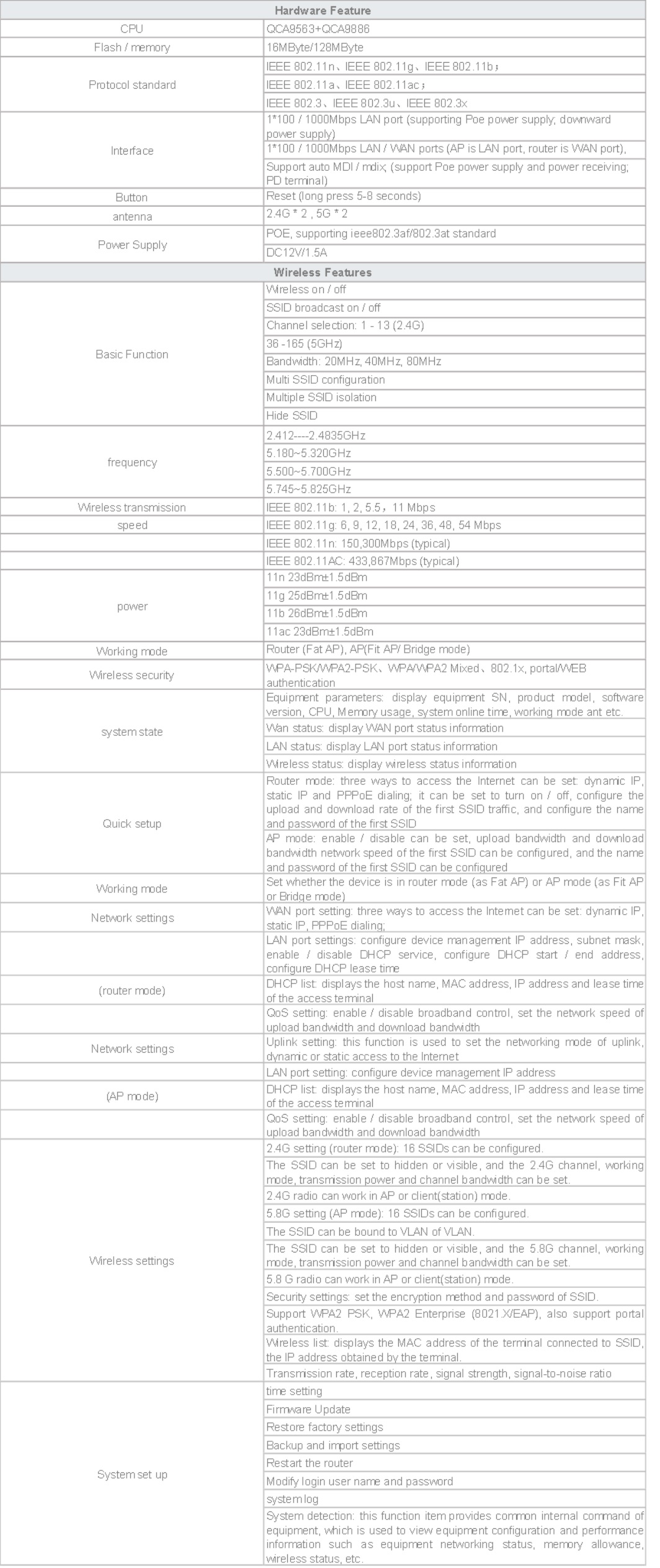 The Ceiling POE wireless access point provides high-speed wireless transmission rate, which conforms to the latest 802.11n standard and 802.11ac standard. The transmission rate is about 1200mbps (2.4G 300mbps + 5g 867mbps), meeting the transmission requirements of all data, voice and video streams.