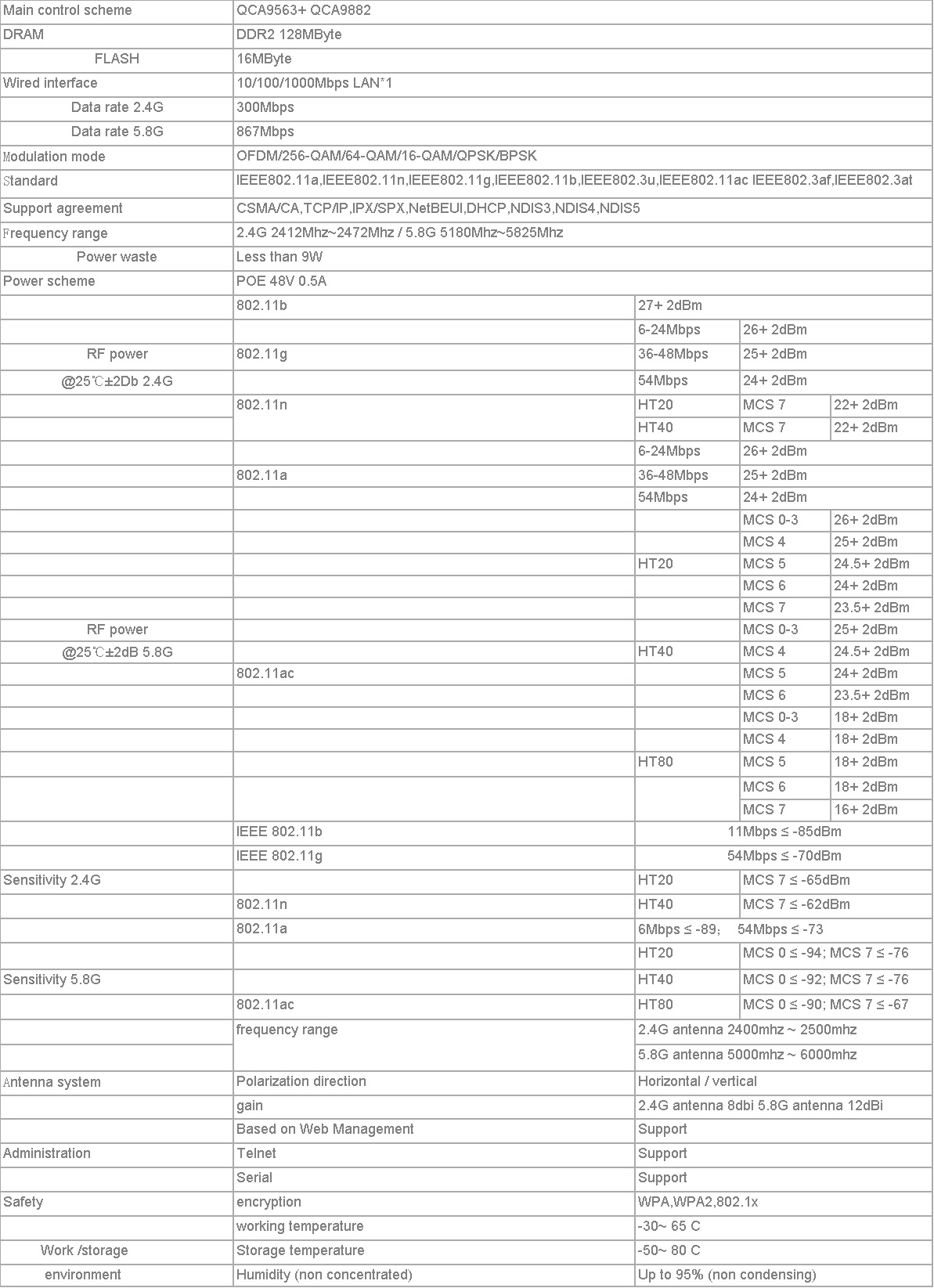 Outdoor POE wireless access point provides high-speed wireless transmission rate, which conforms to the latest 802.11n standard and 802.11ac standard. The transmission rate is about 1200mbps (2.4G 300mbps + 5g 867mbps) and with Omnidirectional integrated antenna design, and also meet the transmission requirements of all data, voice and video streams.