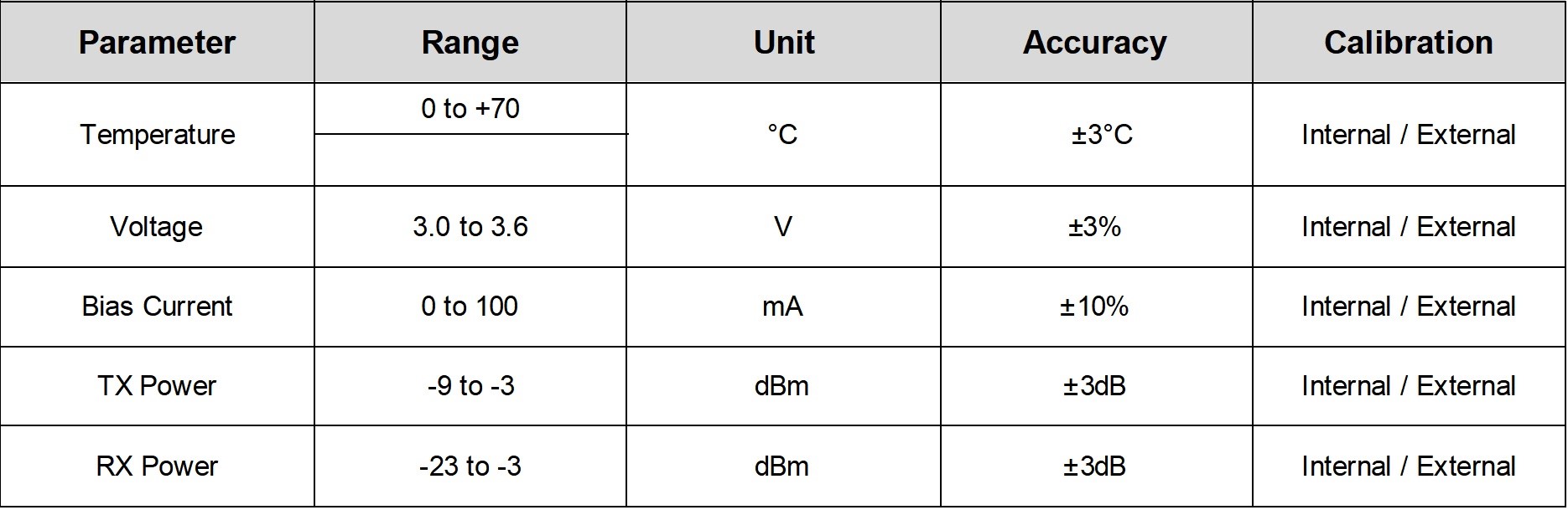 The diagnostic information with internal calibration or external calibration all are implemented, including received power monitoring, transmitted power monitoring, bias current monitoring, supply voltage monitoring and temperature monitoring.