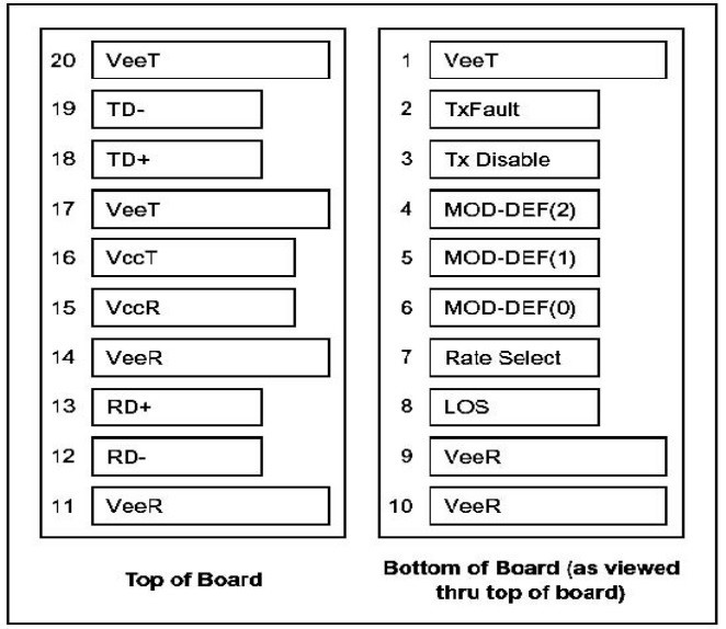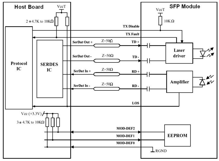 3) Mod-Def 0,1,2. These are the module definition pins. They should be pulled up with a 4.7k~10kΩ resistor on the host board. The pull-up voltage shall be VccT or VccR. Mod-Def 0 is grounded by the module to indicate that the module is present Mod-Def 1 is the clock line of two wire serial interface for serial ID Mod-Def 2 is the data line of two wire serial interface for serial ID