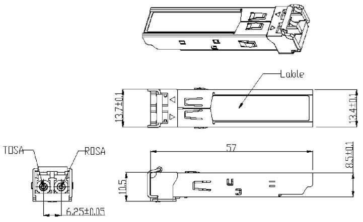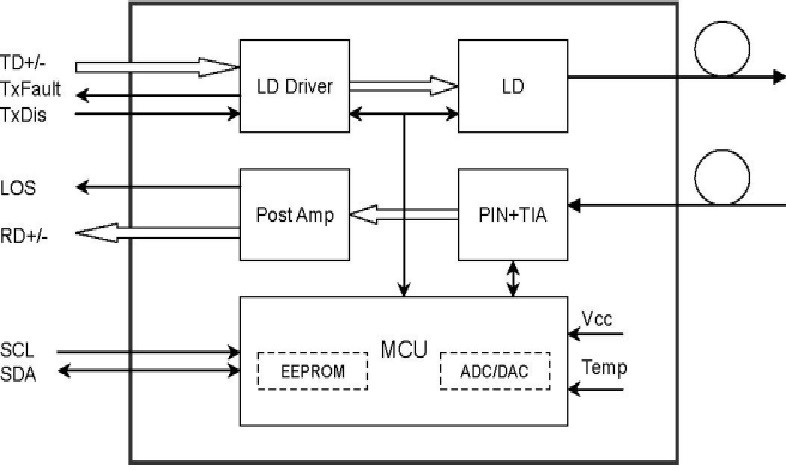 The transceiver consists of three sections: a FP laser transmitter, a PIN photo-diode integrated with a trans-impedance per-amplifier (TIA) and MCU control unit. All modules satisfy class I laser safety requirements.