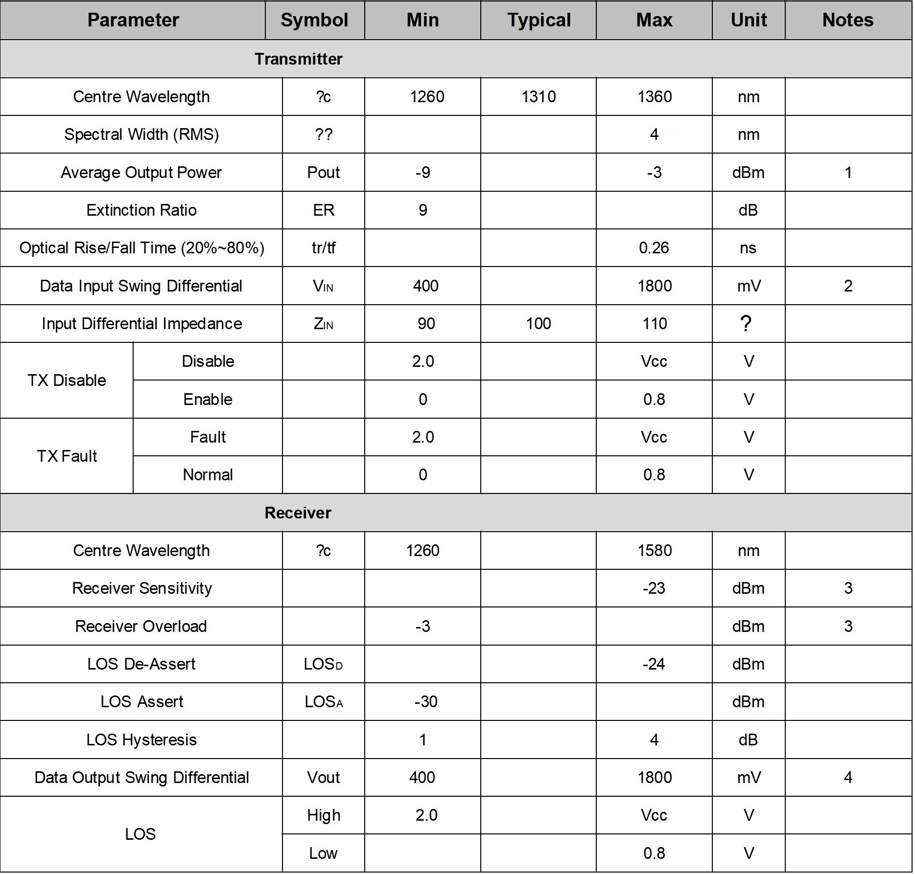 4) LOS is an open collector output, which should be pulled up with a 4.7k~10kΩ resistor. Pull up voltage between 2.0V and Vcc+0.3V. Logic 1 indicates loss of signal; Logic 0 indicates normal operation. In the low state, the output will be pulled to less than 0.8V.