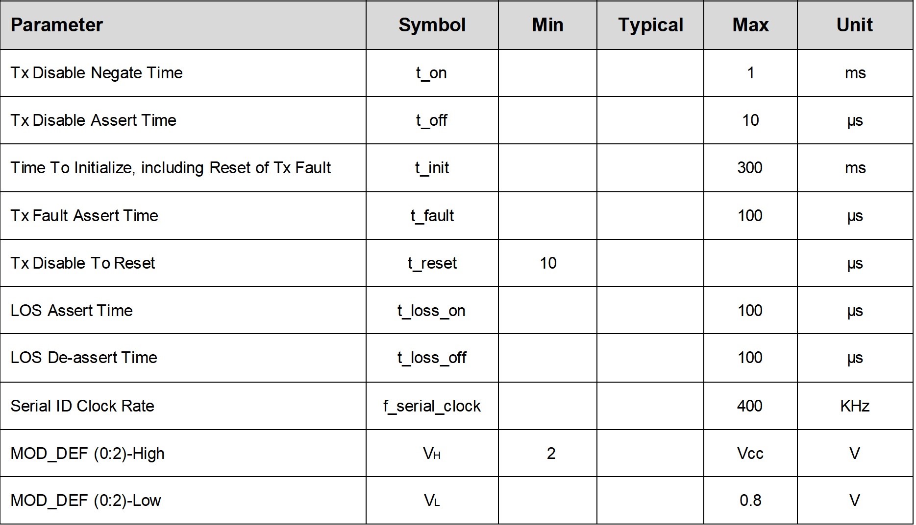 2) TX Disable is an input that is used to shut down the transmitter optical output. It is pulled up within the module with a 4.7k~10kΩ resistor. Its states are: Low (0 to 0.8V): Transmitter on (>0.8V, < 2.0V): Undefined High (2.0 to 3.465V): Transmitter Disabled Open: Transmitter Disabled
