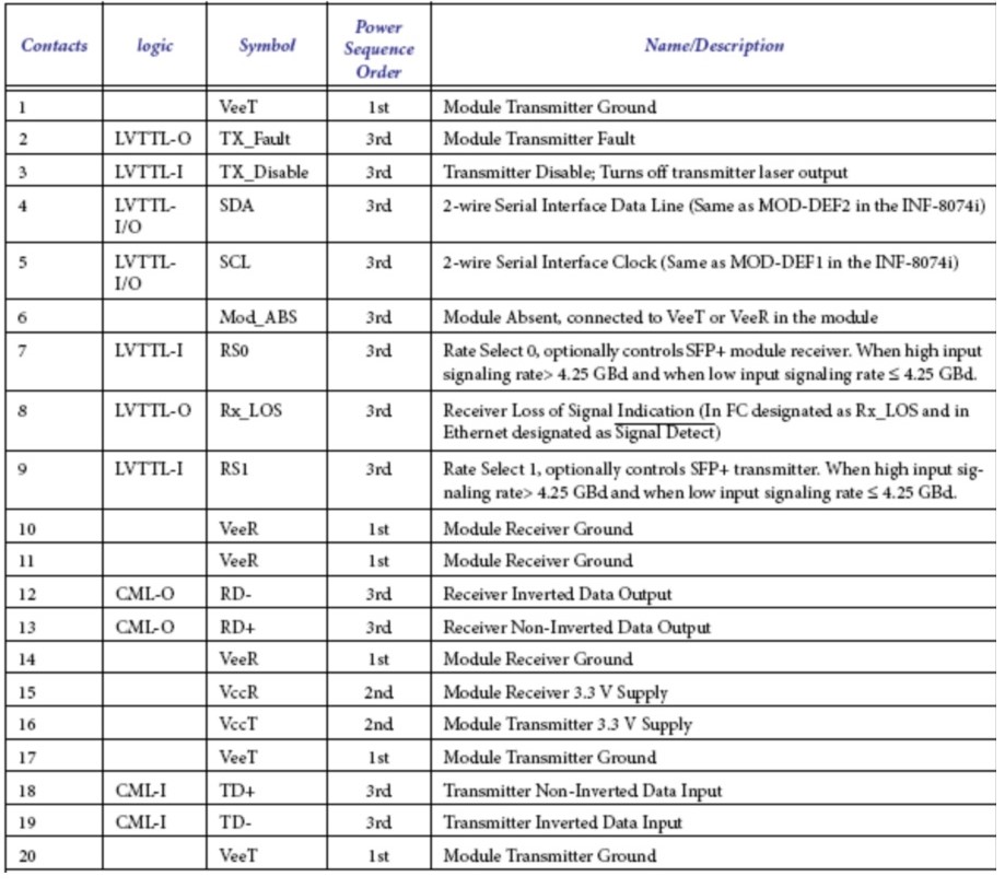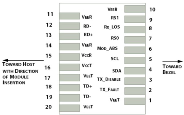 The SFP+ modules are hot-pluggable. Hot pluggable refers to plugging in or unplugging a module while the host board is powered. The SFP+ host connector is a 0.8 mm pitch 20 position right angle improved connector specified by SFF-8083, or stacked connector with equivalent with equivalent electrical performance. Host PCB contact assignment is shown in Figure 2 and contact definitions are given in Table 2. SFP+ module contacts mates with the host in the order of ground, power, followed by signal as illustrated by Figure 3 and the contact sequence order listed in Table 2.