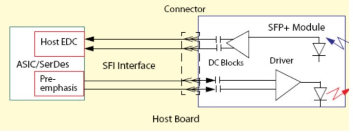 The BIDI SFP+ LR module electrical interface is compliant to SFI electrical specifications. The transmitter input and receiver output impedance is 100 Ohms differential. Data lines are internally AC coupled. The module provides differential termination and reduce differential to common mode conversion for quality signal termination and low EMI. SFI typically operates over 200 mm of improved FR4 material or up to about 150mmof standard FR4 with one connector.